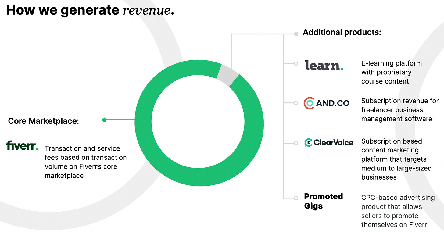 While this isn’t Fiverr’s only source of revenue, it does account for a large percentage of it (the actual number is not provided, but you will get a decent visual at the bottom of this paragraph). The remaining percentage of Fiverr’s revenue is comprised of additional products offered by Fiverr, which includes: