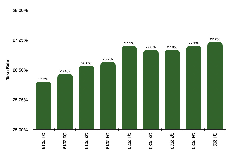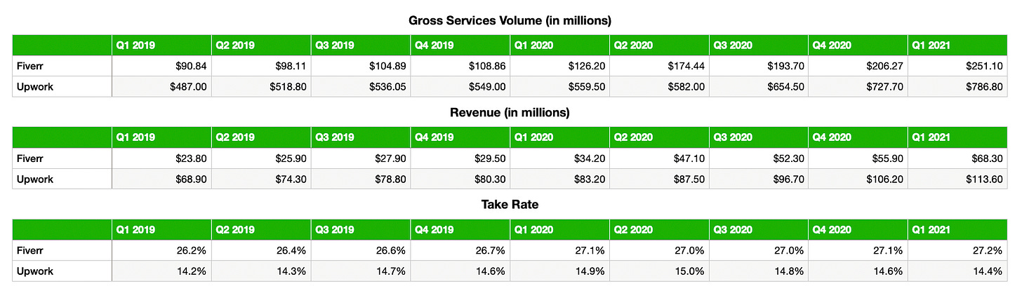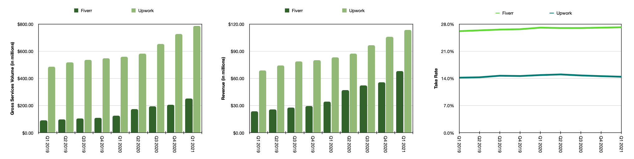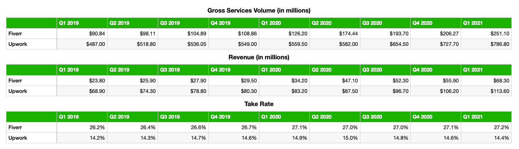 Fiverr’s take rate grew by 3.8% from Q1 2019 to Q1 2021, compared to Upwork’s growth of just 1.4%.