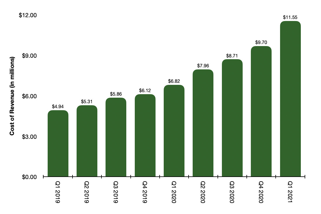 On that same note, Fiverr’s cost of revenue also continues to increase. In Q1 2021, Fiverr’s cost of revenue reached a new high of $11.55M, a 69.4% increase year-over-year. Here is a chart outlining Fiverr’s cost of revenue over the past nine quarters.
