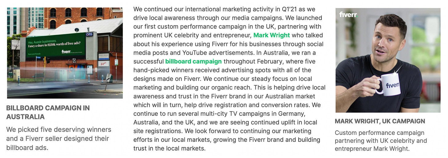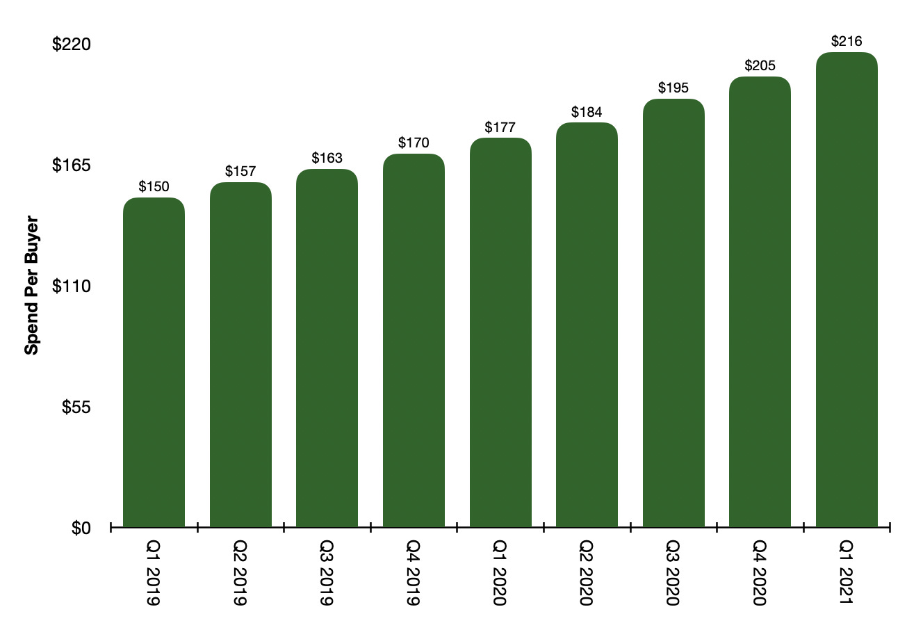 Fiverr prides themselves on their ever-increasing spend-per-buyer, and rightly so. In Q1 2021, Fiverr reported an all-time high in spend-per-buyer, reaching $216 — that’s an increase of 22% year-over-year and 5.4% quarter-over-quarter.