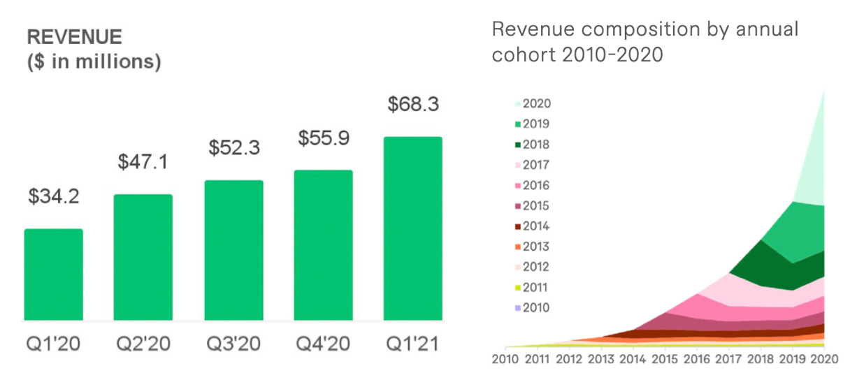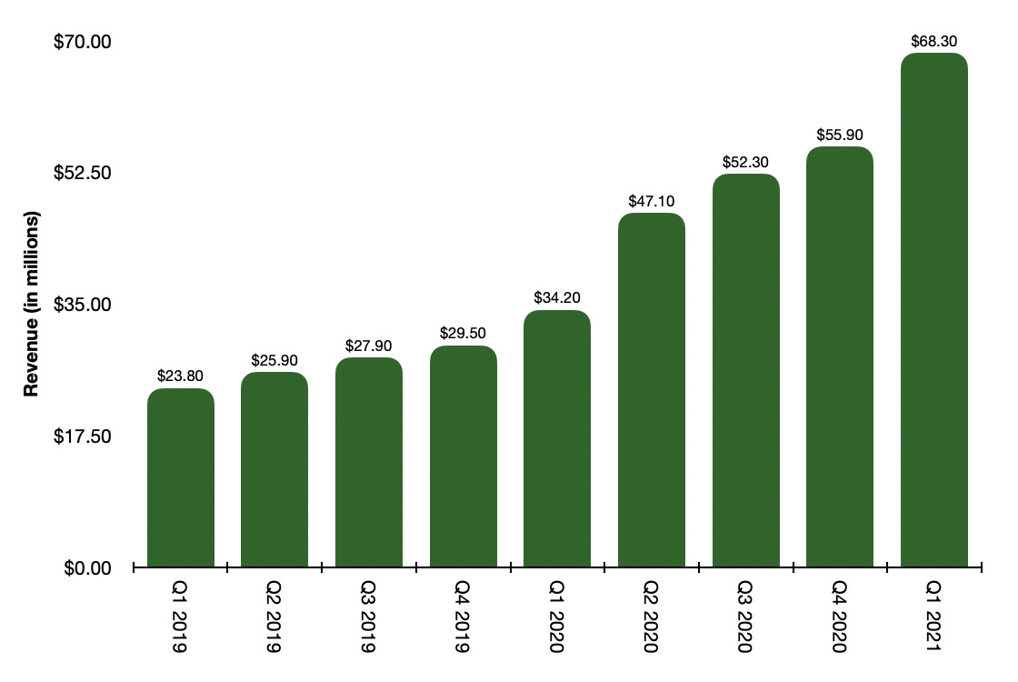 In 2020, Fiverr’s year-end revenue grew to $189.5M, as mentioned earlier, which represents a year-over-year growth of 77%. The company then posted revenue of $68.3M in Q1 2021 (a 100% increase year-over-year) and estimate full-year revenue of ~$305M, which would be a 61% increase from the prior year.
