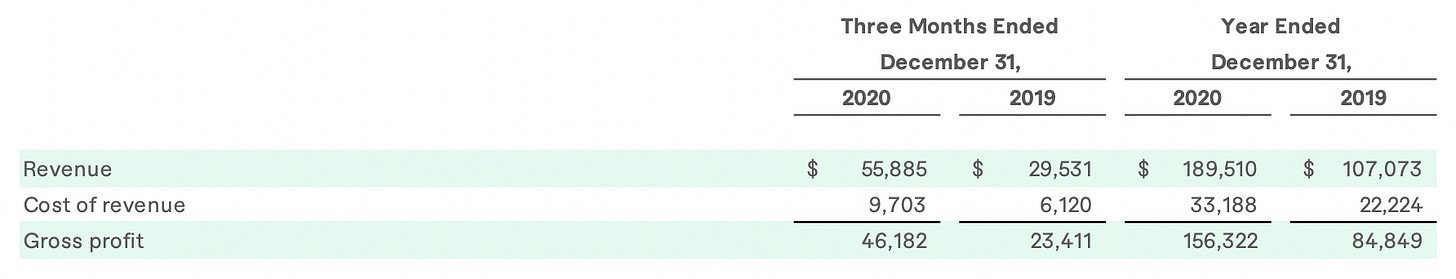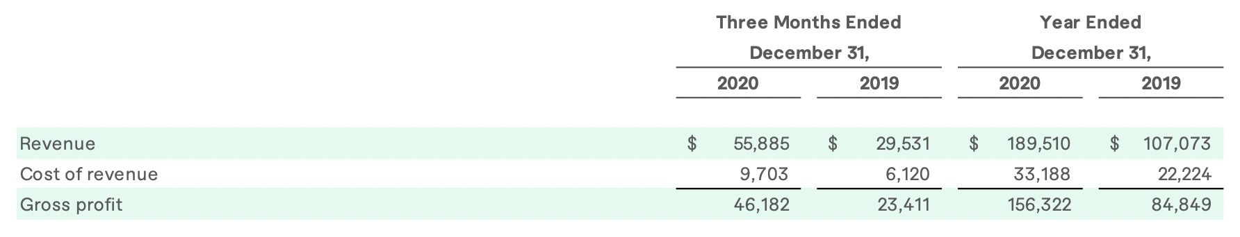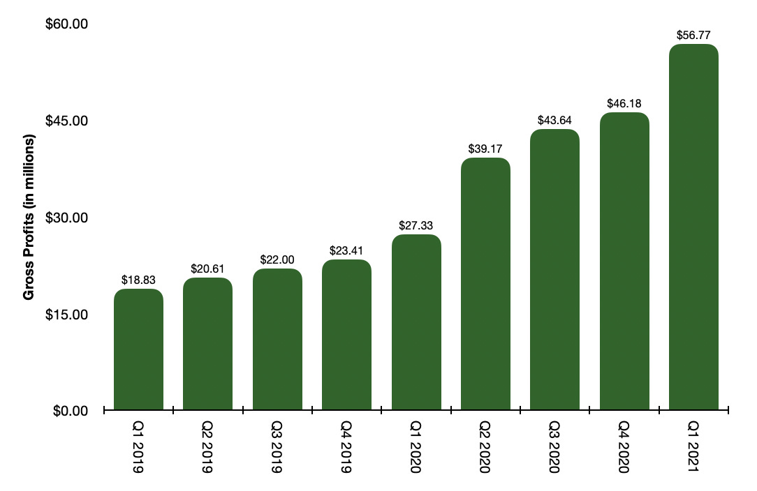 Next, let’s glance over Fiverr’s gross profits. In 2020, Fiverr posted gross profits of $156.3M — nearly doubling 2019’s profits of $84.8M. Along with revenue and cost of revenue, Fiverr’s profits have continued to increase quarter-over-quarter, with the company reporting gross profits of $56.8M in Q1 2021 (a 22.9% increase quarter-over-quarter and a 108.1% increase year-over-year).