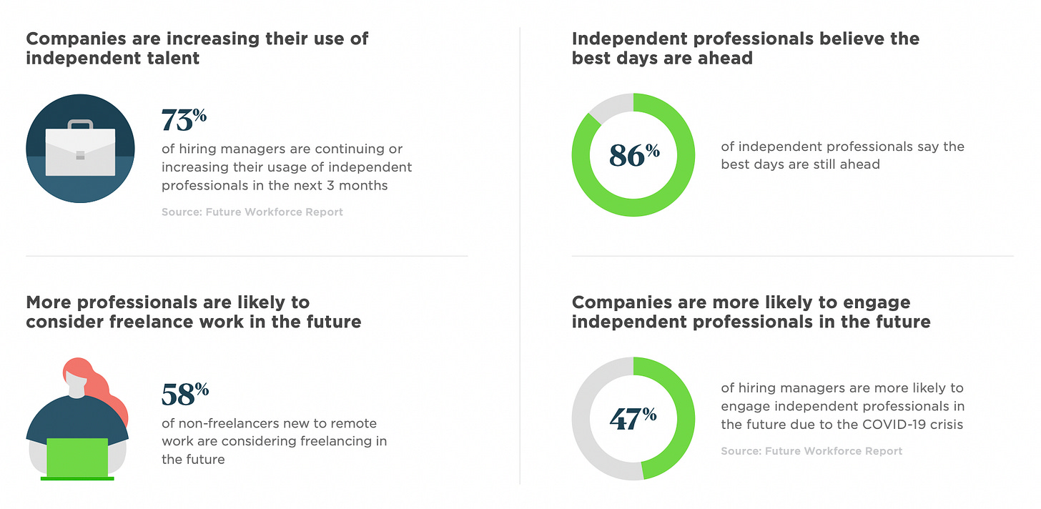Over 70% of hiring managers are considering hiring independent professionals within the next three months, and over 40% of hiring managers predict they will continue using independent professionals well beyond the aftermath caused by Covid-19.