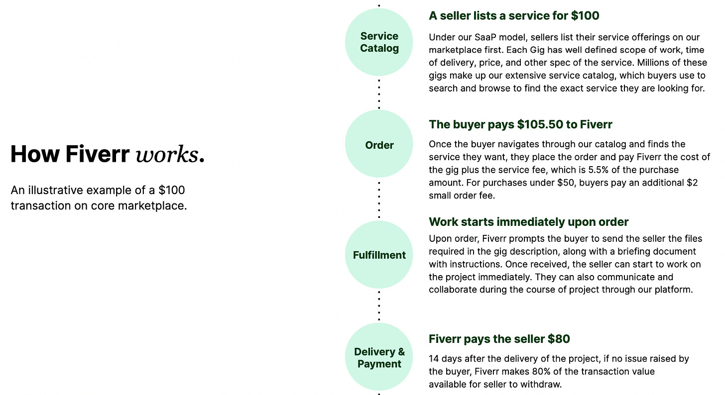 Fiverr takes a cut from each and every transaction made on their platform — they take 5.5% from the buyer and 20% from the seller. That’s pretty much it. Fiverr does a wonderful job of visualizing this process in their company presentation, which is where I have been obtaining most of the graphics used in this section of the essay.
