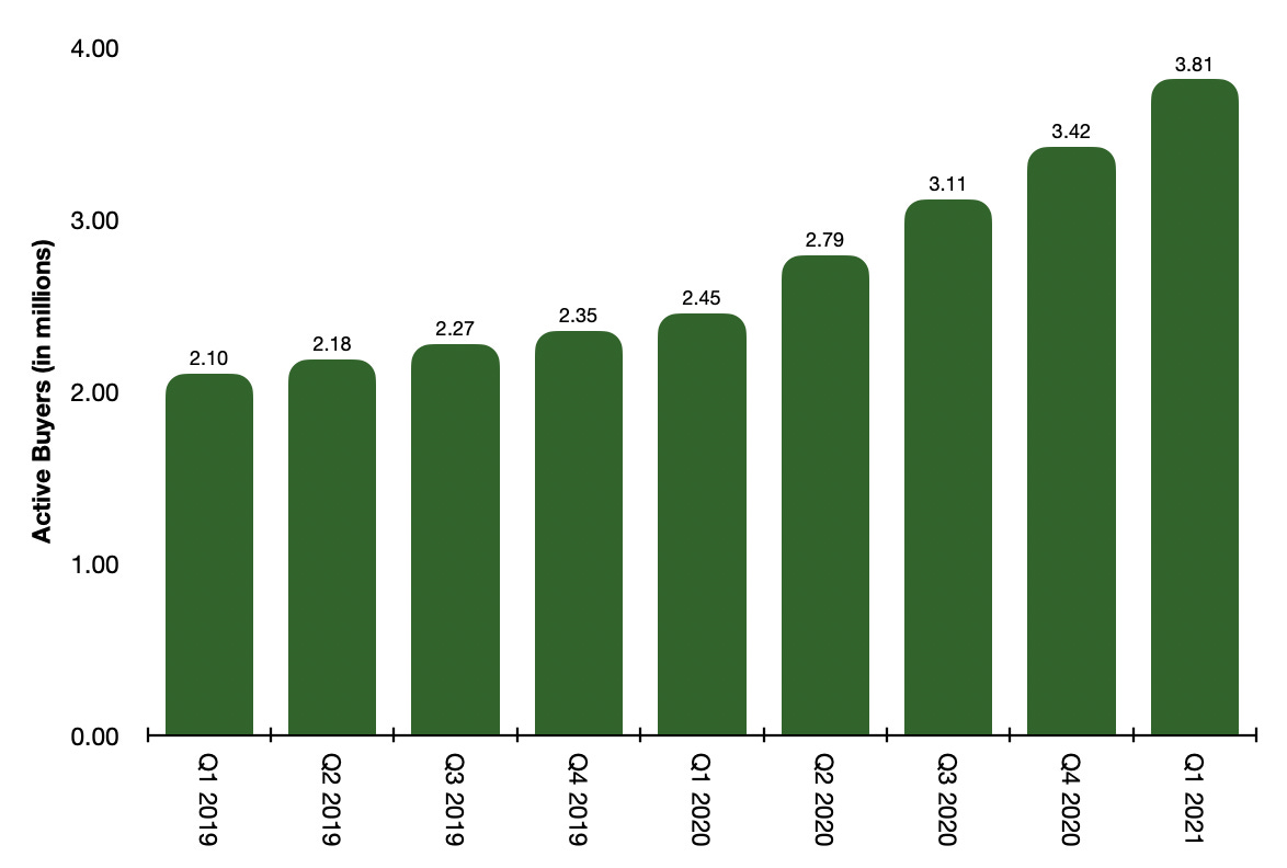 In 2020, Fiverr’s active buyers reached 3.42M, up 45.3% from 2019’s year-end total of 2.35M. Additionally, Fiverr added nearly 400,000 new active buyers in Q1 2021 — their most ever in a single quarter — bringing their current total to 3.81M.