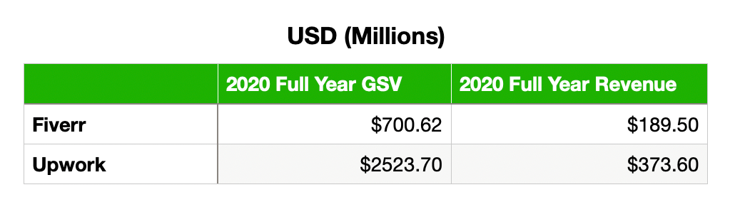 Likewise, Fiverr’s 2020 revenue was $189.5M while Upwork’s revenue was $373.6M.