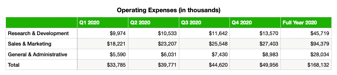 Lastly, let’s go over Fiverr’s operating expenses. Like any strategic “growth” company, Fiverr bets on themselves — this is evident by their operating expenses. In 2020, the company accumulated $168.13M in operating expenses (a 40.58% increase from the $119.6M they spent in 2019). Operating expenses are broken down into three categories: research and development, sales and marketing, and general and administrative. Below is a table with the corresponding amount spent in each category during the past fiscal year.