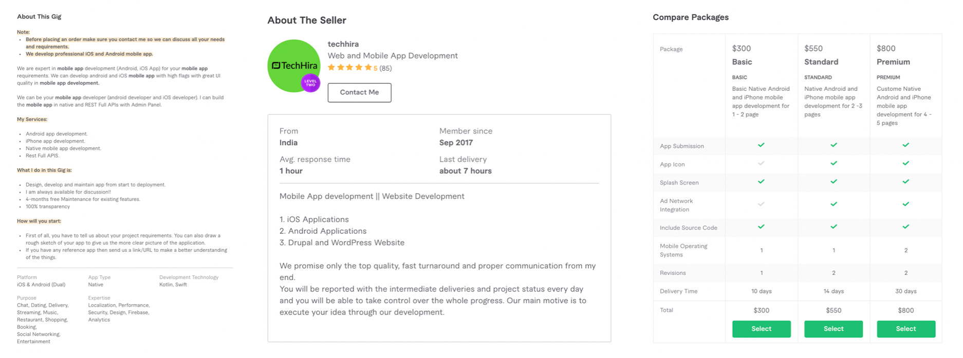 A “Compare Packages” section where the customer can view different packages offered by the seller, complete with a comparison chart.