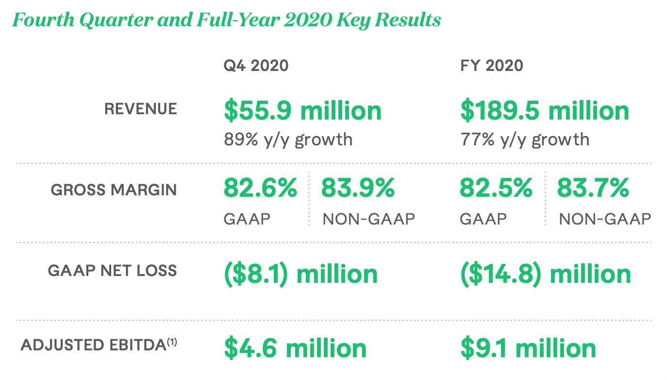 Fiverr achieved quarterly adjusted EBITDA profitability for the first time in the company’s history in Q2 2020 and finished 2020 with an adjusted EBITDA of $9.1M. However, since becoming a public company, Fiverr is yet to report a quarterly (or yearly) GAAP net profit. Below is a screenshot of Fiverr’s Q4 2020 ER.